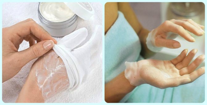 - Обернуть кисти рук компрессной бумагой и надеть варежки.