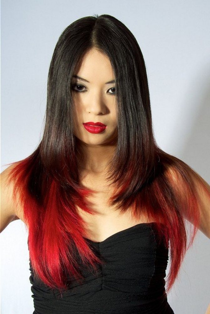 Такое окрашивание особенно хорошо смотрится на шатенках или брюнетках. Омбре «черный с красным» позволит создать образ роковой леди, при этом переход может быть как плавным (более женственный вариант), так и достаточно контрастным – его лучше делать при короткой стрижке с простыми линиями.