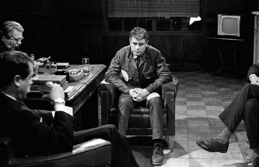Сцена из спектакля «Мольба о жизни» по пьесе Жака Деваля в постановке Московского драматического театра им. М.Н. Ермоловой. Режиссер — Л.В. Варпаховский. Робер Массубр — Владимир Андреев (слева), Пьер Массубр — Леонид Галлис