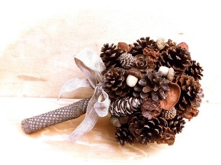 Зимой будет здорово украсить готовый букет шишками или еловыми веточками.