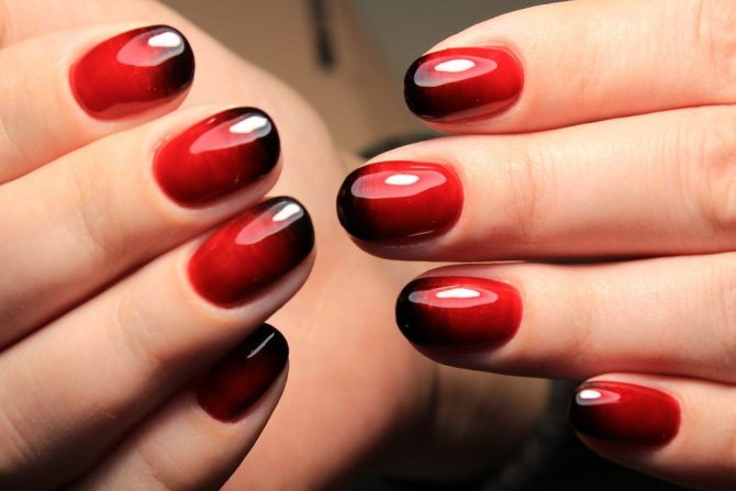 - градиентным маникюром, где между контрастными цветами делается мягкий переход;