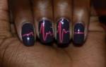 - Графическая разметка ногтевой пластины с использованием трафаретов. Для этого на подготовленный ноготь наносится красный тон так, чтобы не задеть контурную линию кутикулы. Старайтесь прокрасить ноготь со всех сторон, чтобы избежать белых просветов или нежелательного эффекта штриховки. Когда красная основа высохла, на ноготь наклеивается трафарет в виде полосок, квадратов, треугольников или кружков. Ноготь повторно покрывается лаком, но уже черного цвета (лучше использовать лак с кистью, в которой острый кончик). Когда покрытие высохнет, нужно аккуратно удалить трафареты. В завершение используем прозрачный лак с зеркальным отблеском.