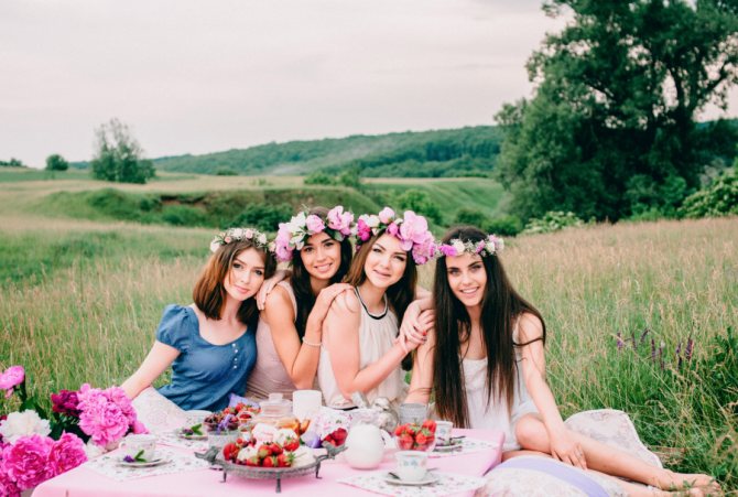 - «–»: вариант девичника на природе подходит только для теплой поры и зависит от капризов погоды; предполагает спортивный тип одежды; придется позаботиться о репеллентах от насекомых, головных уборах от солнца и пледах, если станет под вечер холодно; требует серьезной подготовки (продумывании посадочных мест и столика, покупки еды и напитков, доставки к месту праздника подружек и всего необходимого).