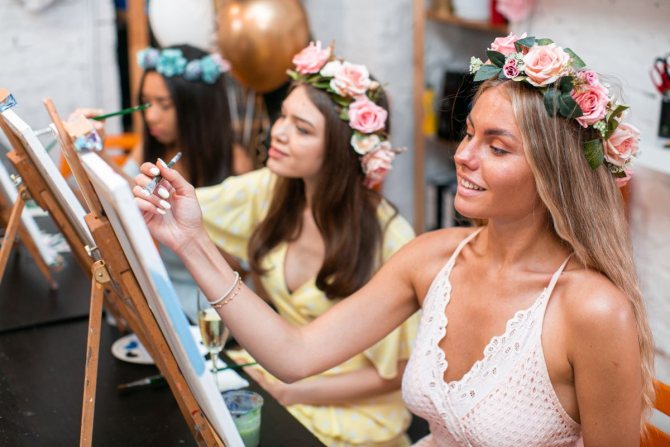 Вне зависимости от того, какой сюрприз вам преподнесет питерская погода, вы всегда можете рассчитывать на классный праздник в студии Draw Up. Под чутким руководством Ведущего-художника каждая из вас нарисует свою картину на настоящем холсте профессиональными красками. Не переживайте, если не держали кисти в руках — специалисты подскажут и помогут. Атмосфера будет не только творческой, но и праздничной — принесите с собой еду, торт, несколько бутылок шампанского и веселитесь под зажигательную музыку вместе с ведущим. Можно пригласить фотографа, который запечатлит все самые крутые моменты, или обойтись классными селфи — для них здесь хорошее освещение и симпатичный фон.