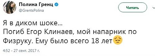 Полина Гренц, коллега Егора Клинаева по сериалу «Физрук», отметила, что шокирована его внезапной гибелью. Актриса посвятила молодому человеку пост в «Твиттере».