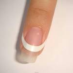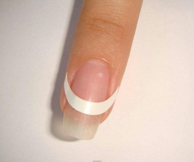 - на ноготь прикрепляется специальный трафарет, который позволяет аккуратно покрыть кончик ногтя;