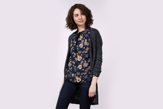 Здесь существует всего одно стилистическое ограничение – не смешивать вещи одной фактуры, иначе образ получится перегруженным и излишне тяжеловесным. Например, не следует надевать трикотажную кофту поверх платья из такого же материала. Для более простого повседневного образа хорошо подойдет композиция из джинсов цвета индиго, бежевой кофточки на одну пуговицу с объемным узором и надетой под нее льняной блузки с круглым вырезом горловины.
