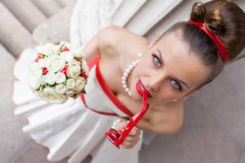 - Красная лента. Повязанная на талии или вплетённая в причёску лента тоже служит оберегом для невесты на свадьбе.