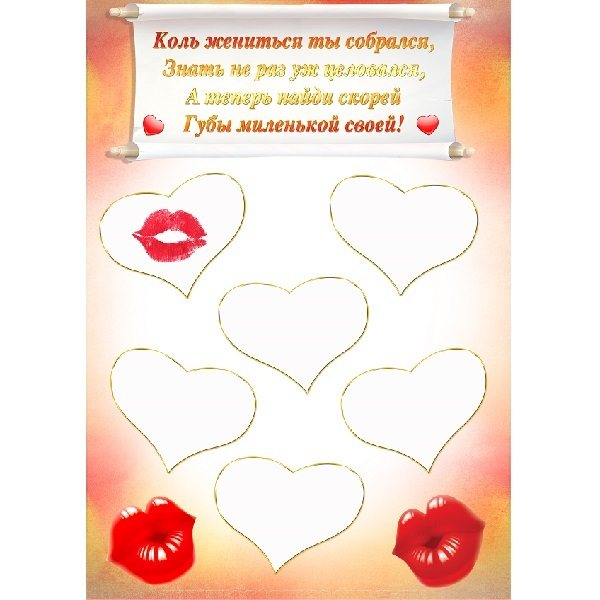 - Конкурс «Поцелуй невесты». Это самый известный из конкурсов, проводимых при выкупе. Для него берется большой ватман, невеста и ее подружки красят губы яркой помадой, а после этого целуют лист. Жениху предлагают определить, где находится отпечаток губ невесты.