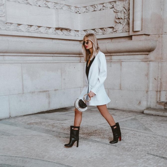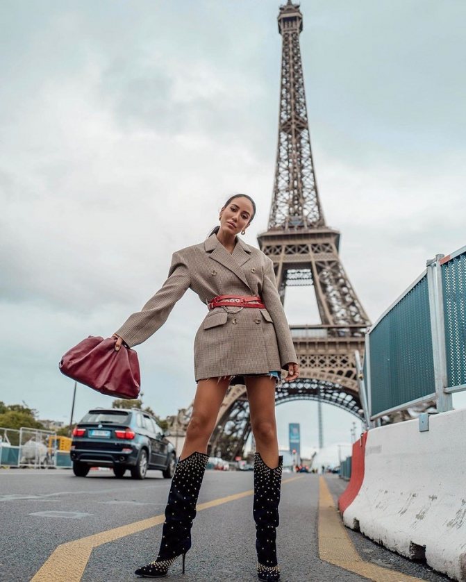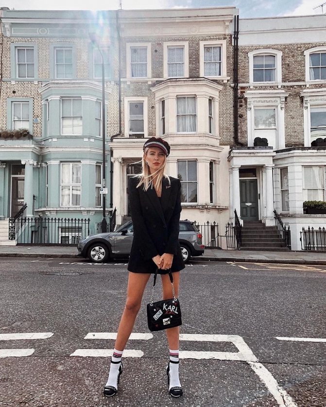 Многие модные инфлюэнсеры предпочитают носить платье-пиджак с высокими ботфортами-чулками. Однако не каждая обычная девушка решится пройтись в таком комплекте по улицам своего города. Поэтому для «подстраховки» можно надеть шорты, юбку или велосипедки.