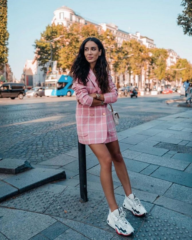 В повседневности платье-жакет хорошо сочетается с белыми кроссовками. Чтобы образ получился стильным, добавь несколько модных аксессуаров, например, трендовую сумку и солнечные очки.