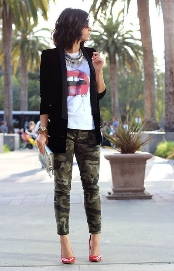 Футболка белая или в полоску создаст с черным пиджаком прямого кроя или блейзером повседневный лук. Добавьте удобную обувь: кроссовки, балетки или кеды и можно отправляться гулять или по магазинам. Не забудьте подвернуть рукава для стильности и повязать на шею косынку или платок.