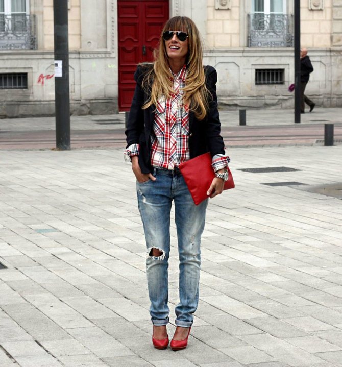 Если пиджак свободного кроя, под него лучше не надевать широкие джинсы или брюки, это утяжелит силуэт, и добавит вам визуально вес. С приталенным коротким блейзером можно надеть более широкие брюки или джинсы бойфренды. Подчеркнутая талия уравновесит пропорции.