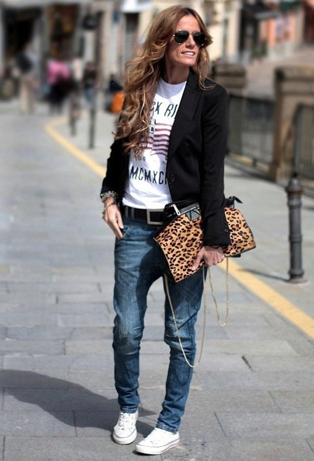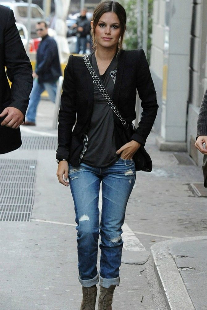 Джинсы любые всегда хорошо сочетаются с черным пиджаком. Но тут следует обратить внимание на объемные пропорции силуэта.