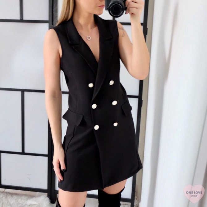 - В этом году актуальны жилеты во всех вариациях, поэтому обрати внимание на платье-пиджак без рукавов. Его можно надеть на вечеринку с кожаными ботфортами или в офис с легкой блузой, плотными колготками, остроносыми ботильонами на блочном каблуке.