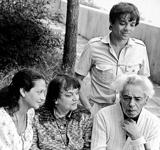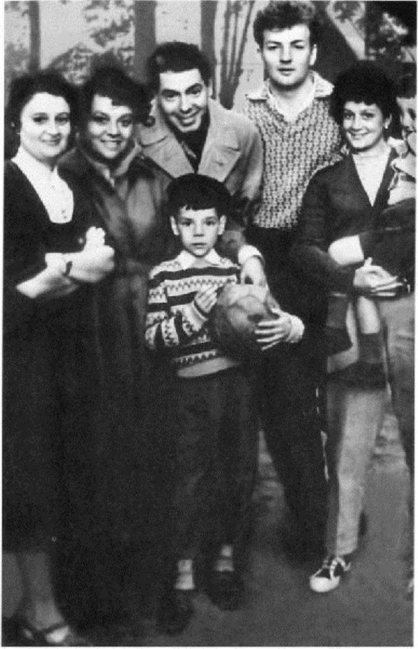 Среди родственников. Слева направо Е. М. Иоффе (сестра Ромы), Р. М. Иоффе, А. И. Райкин, М. М. Державин, Е. А. Райкина с племянником на руках, в центре стоит Костя Райкин. 1957г.
