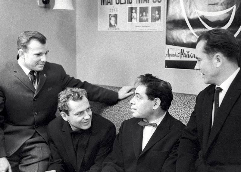 Юрий Гагарин (крайний слева), Герман Титов (второй слева), Аркадий Райкин и Павел Попович (справа) в гримерной артиста.