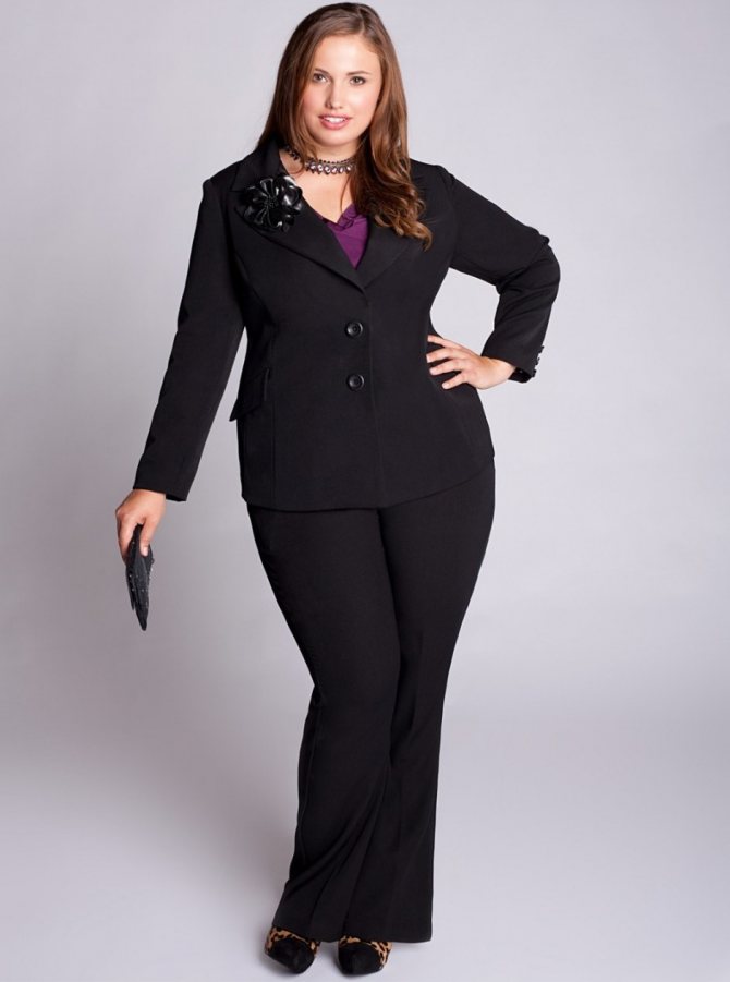 Что касается фасонов, сейчас разнообразие огромное: разная длина и ширина брючин, приталенные жакеты или классические пиджаки. Конечно, на стройных девушках всё смотрится хорошо, а вот обладательницам пышной фигуры нужно внимательно подходить к выбору фасонов. Подбирать женские костюмы больших размеров нужно так, чтобы талия не была перетянута, а также не образовывались складки в разных интимных местах.