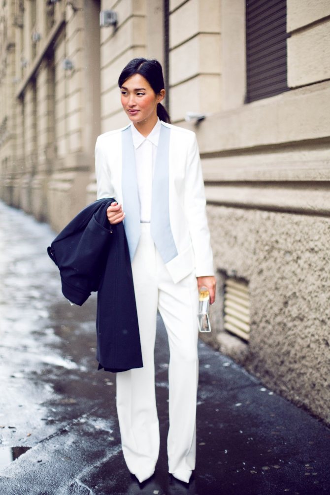 - Белый – новый чёрный. Летом он становится особенно актуальным – дарит прохладу, поскольку отражает солнечный свет. По покрою и конструкции ансамбль может быть любым – с «палаццо» и двубортным блейзером, кюлотами и жакетом-шанель, брючками-сигаретами и пиджаком длиной до середины бедра с широкими лацканами. Не менее гармоничным будет комплект из ткани в тонкую чёрную полоску.