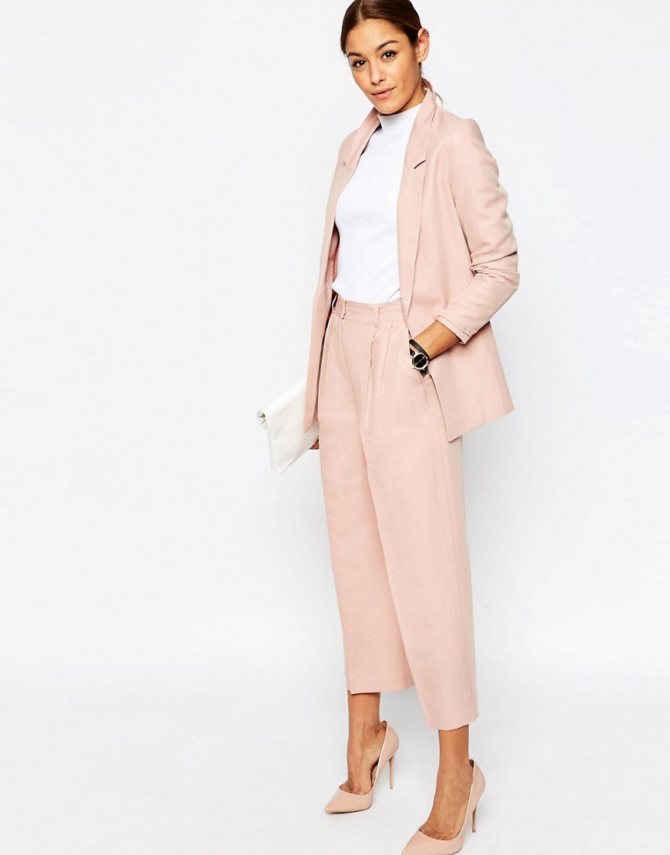 Для теплого времени года подойдут варианты с укороченными брюками и рукавами пиджака в 3/4