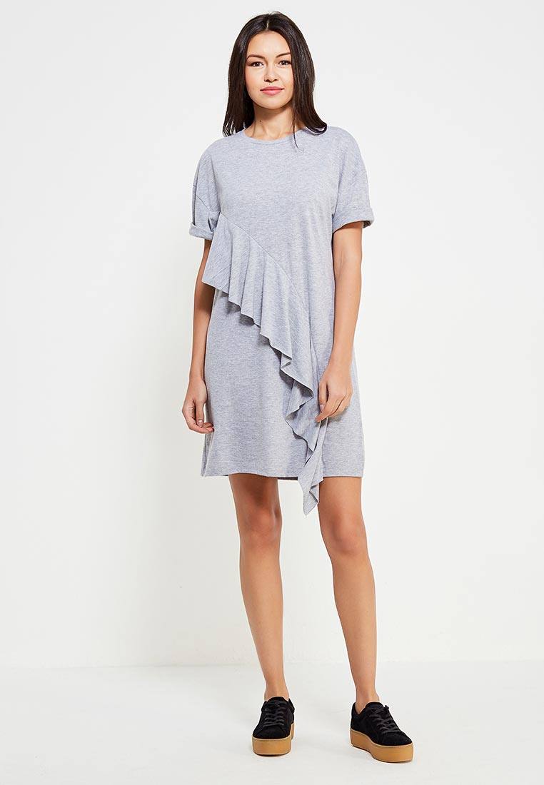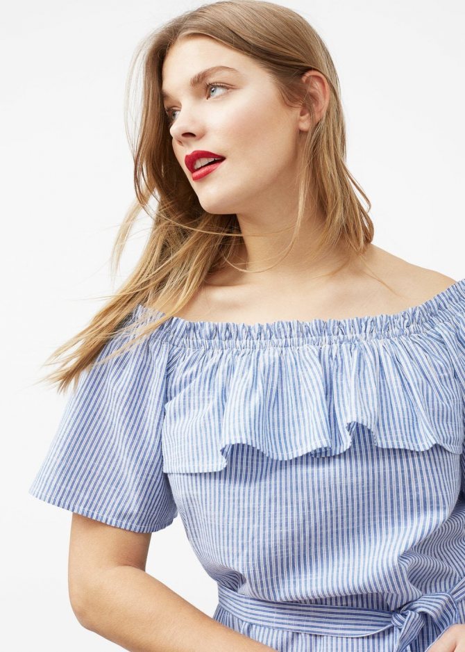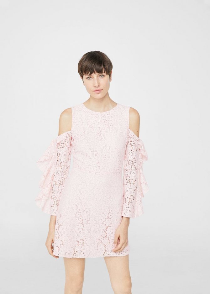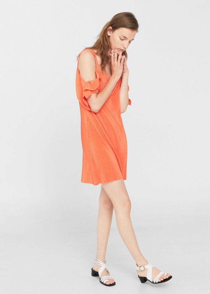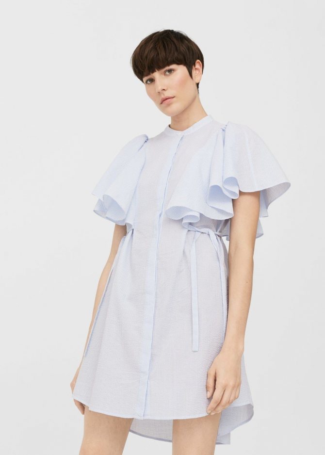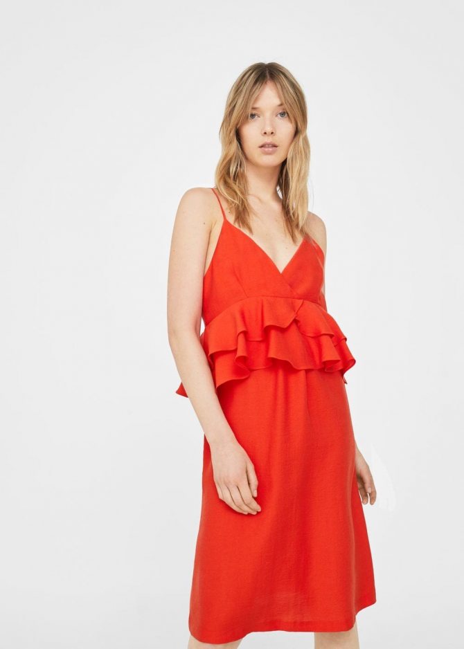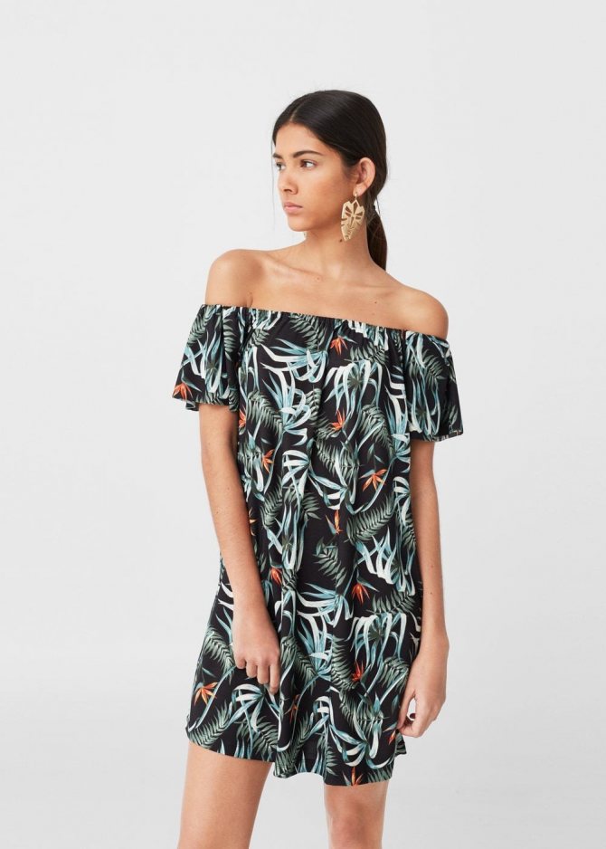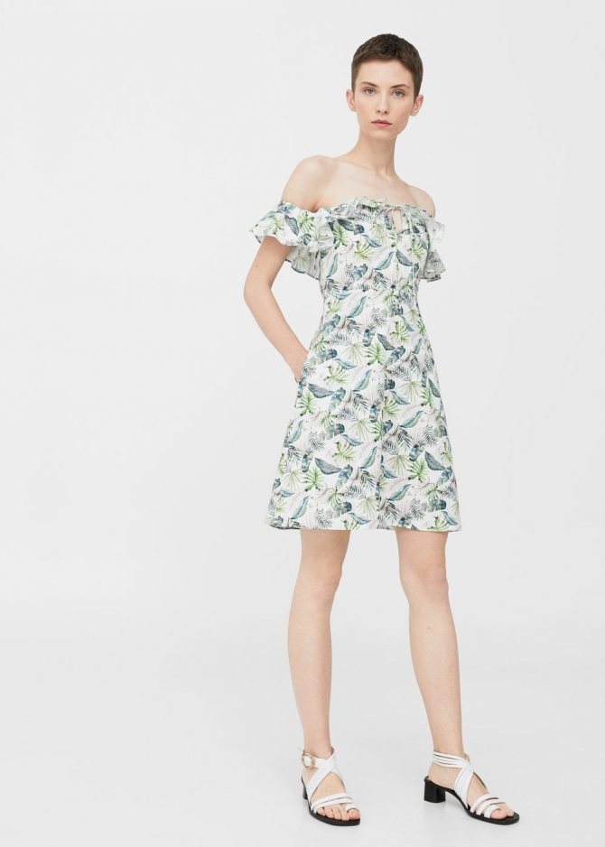 - Короткое платье с крупными воланами по линии плеч.