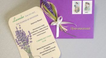 Открытки могут быть квадратные, прямоугольные, в один лист или книжечкой. Сейчас популярность набирает тренд: приглашения, написанные на бежевой бумаге, которую приклеивают в середину специальной фиолетовой заготовки с ажурными краями. После просыхания боковины складывают и обвязывают лентой.