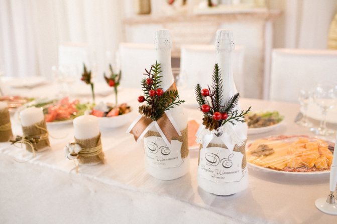 У зимнего оформления свадебного стола есть характерные особенности. Например, в качестве посуды выбирают прозрачный хрусталь и фарфор белого цвета, который идеально вписываются в тематику торжества.