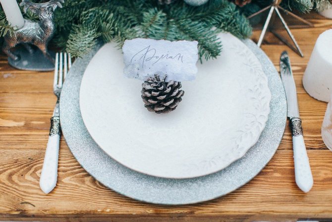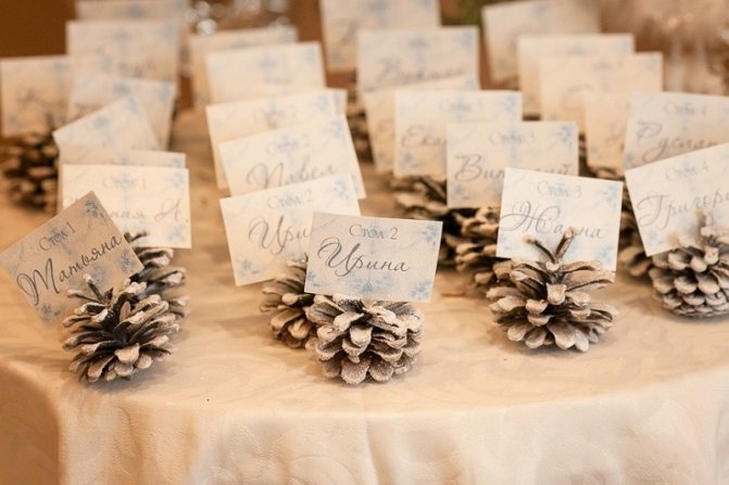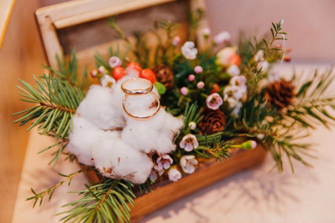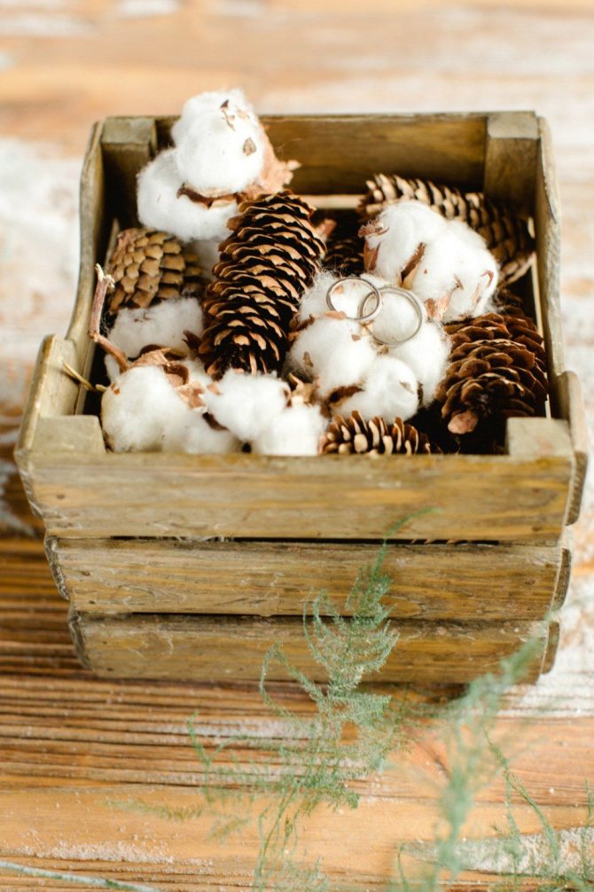 Небольшая коробочка из шишек может заменить традиционную подушечку для колец. Гирлянда из шишек станет отличным украшением зимней церемонии. Такие же гирлянды, но уже с зеленью и цветами, украсят столы гостей вместо тканевых дорожек. Дополнить их могут изящные свечи в высоких тонких подсвечниках.