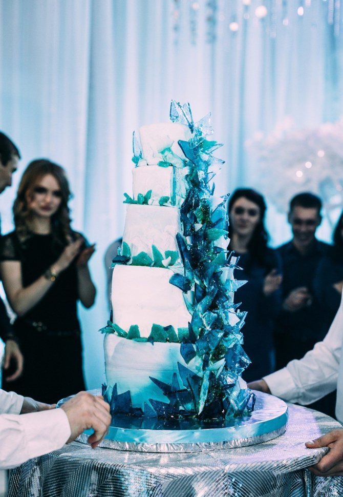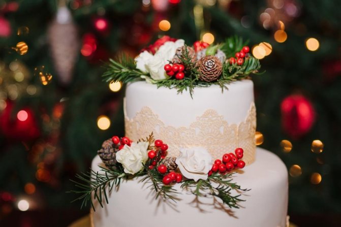 Самый главный десерт праздника – свадебный торт. Потрясающе смотрятся белоснежные многоярусные торты. Сладкое угощение можно украсить съедобными снежинками, серебристыми бусинами, шишками из мастики, веточками рябины и ели. Еще один вариант для оформления торта – декорирование морозными узорами и орнаментами в зимнем стиле. Хороший кондитер предложит молодым немало интересных вариантов для оформления главного праздничного десерта.