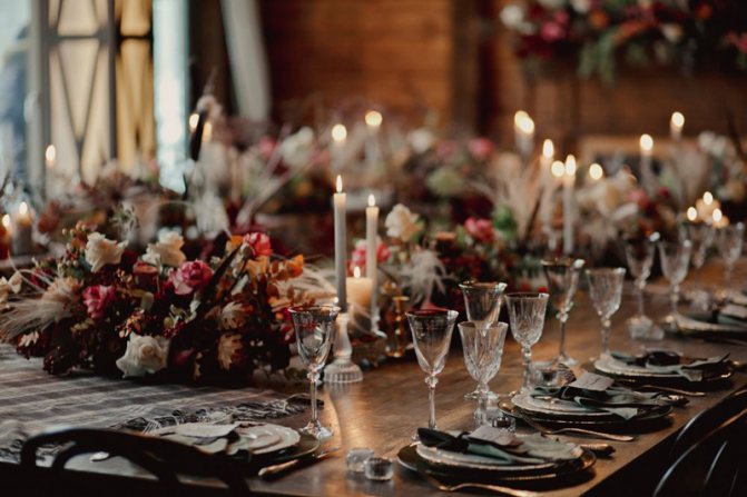 Свечи надо будет менять по мере сгорания, чтобы поддерживать настроение и красивую картинку. Из одних только свечей вкупе с разными подсвечниками можно сделать великолепную дорожку на столы гостей. Подсвечники могут быть классическими или же креативными: пустые бутылки, шишки, веточки, деревянные спилы и др.