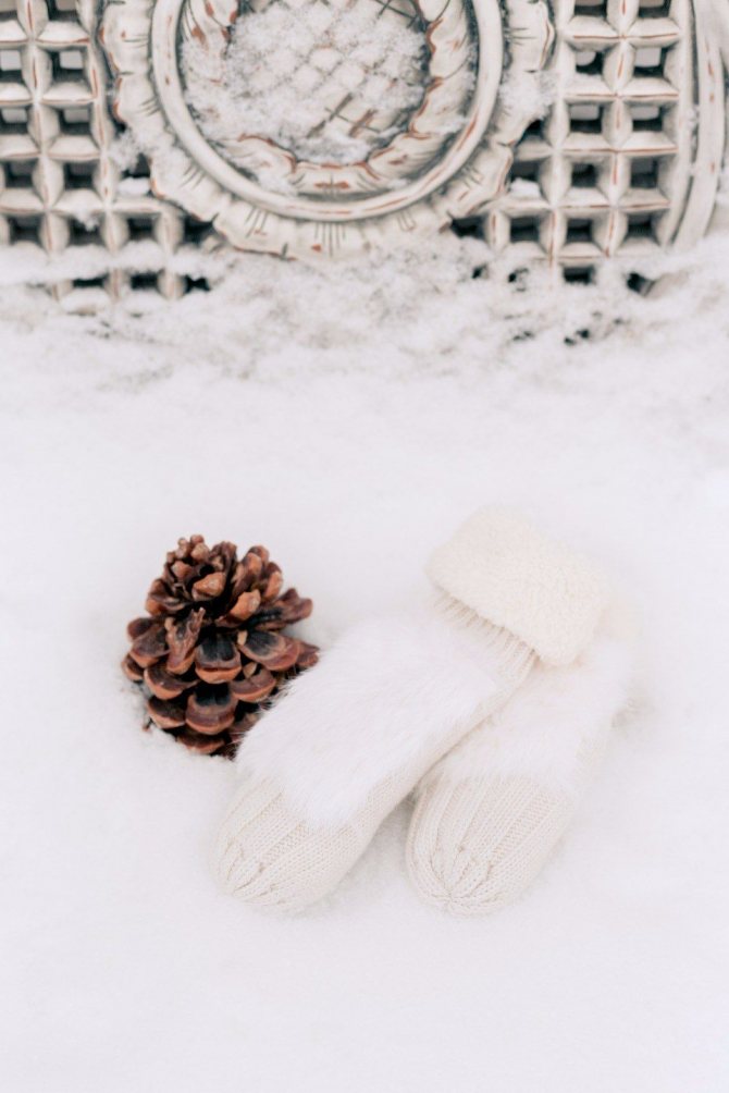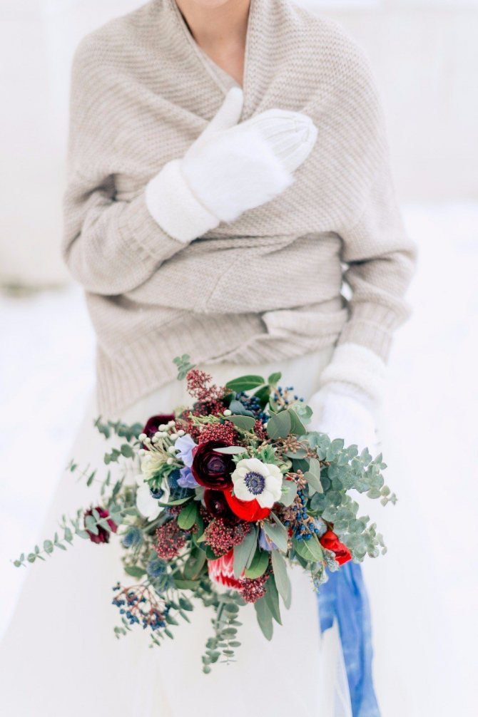 Бутоньерку жениха также можно сделать из маленького клубочка. А вязаные аксессуары подарят не только особый шарм образу зимней невесты, но и тепло. Это может быть объемный шарф, снуд, варежки или перчатки. А может быть и само платье!