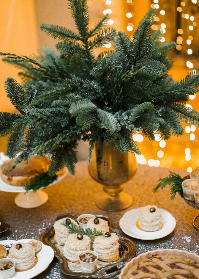 Для оформления стола используют композиции из сосновых шишек и еловой хвои. Их декорируют блёстками, кристаллами, тесьмой или соцветиями хлопка. Оригинально смотрится флористика с ягодами калины или рябины. Её можно разместить среди угощений, используя маленькие вазы или подсвечники.