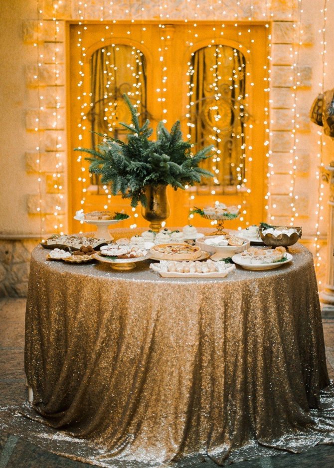 Блестящие раннеры, например, в серебряных, золотых, бронзовых, шоколадных или даже белых тонах украсят столы гостей. В этом случае подбирать вазы и декоративные дополняющие следуют особенно тщательно: это могут быть стеклянные, керамические или специально матированные емкости. Звездой вечера может стать свадебный торт, отделанный съедобным кондитерским глиттером. А завершить банкет можно дорожкой из множества бенгальских огней!