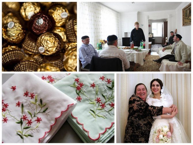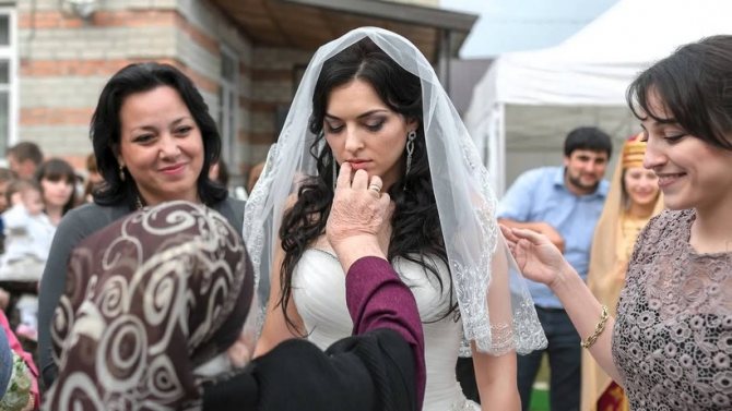 - Обряд примирения с родными. Обряд примирения родителей жениха с невесткой происходил после ее торжественного выхода из комнаты. Старшая женщина в доме мазала девушке губы маслом и медом, обсыпала сладостями: чтобы жизнь была сытой и сладкой. После устраивался общий праздник, длившийся несколько дней.