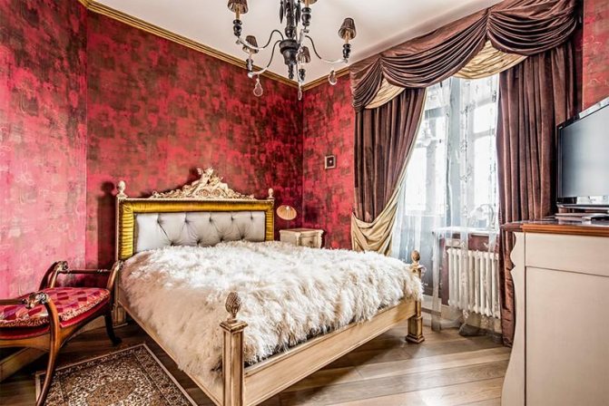 Хозяйская спальня выполнена в бордово-красных цветах, а центральное место здесь занимает большая кровать светлого дерева.