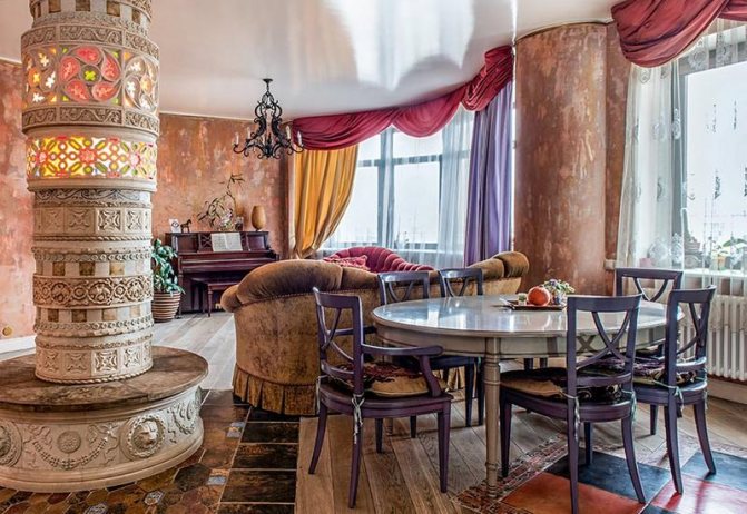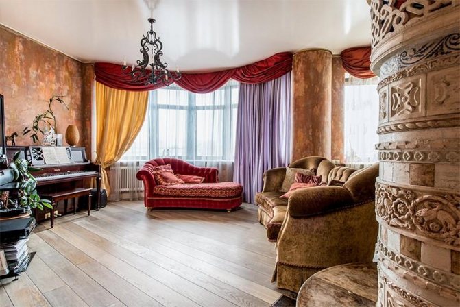 Гостиная представляет собой одно единое пространство, совмещающее кухню, обеденную, собственно гостиную и холл. Особое внимание привлекают к себе эркерные окна с панорамным остеклением в обрамлении ярких штор. Рядом расположились два дивана, отделанные бархатом в бордовых и горчичных цветах.