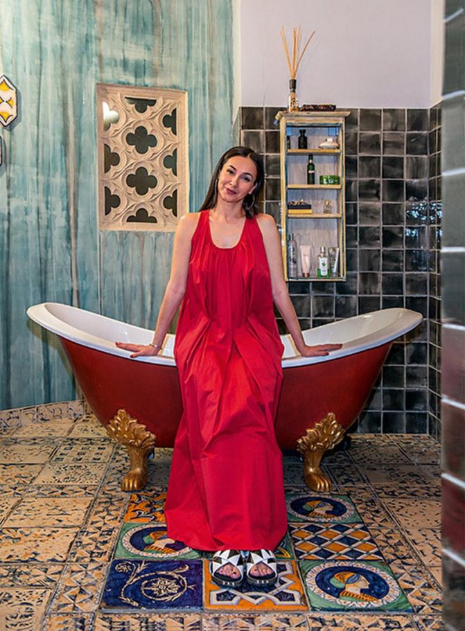 Дизайном предусмотрено два санузла. Гостевой оформлен в классическом современном стиле в бело-берёзовой гамме. А хозяйский — настоящее произведение искусства, с цветными витражами и отдельно стоящей ванной на ножках в виде львов. Стены отделаны австрийской глазурованной плиткой в темно-сером тоне, одна из стен в контраст оформлена в берёзовой гамме, а в цвет ей в центре помещения выложен мозаичный ковер. Единое пространство выглядит очень эффектно.