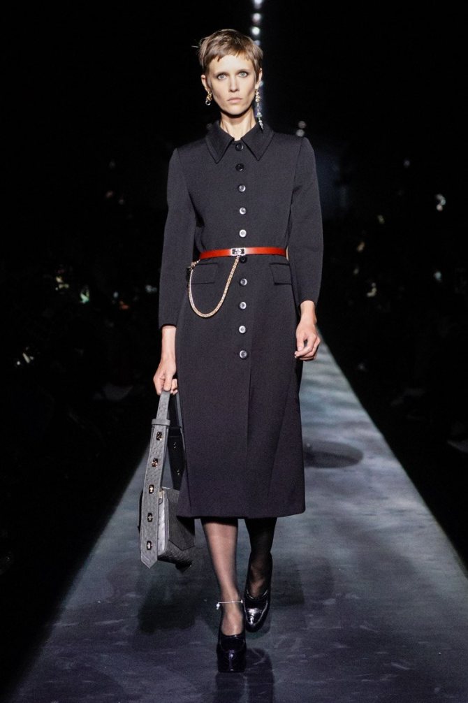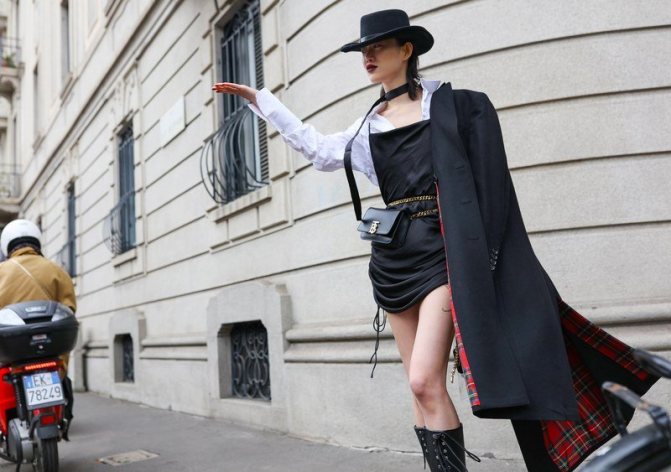 Придаст элегантности такому фасону однотонный ремешок или меховое изделия на воротнике.