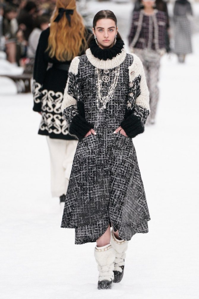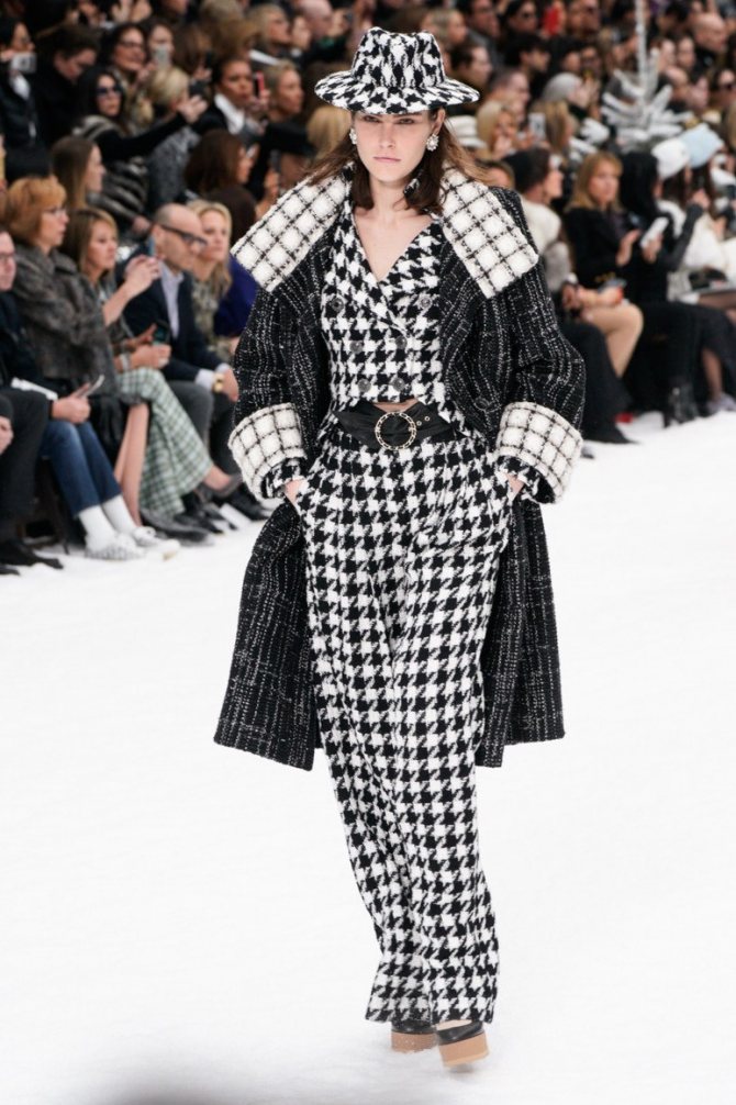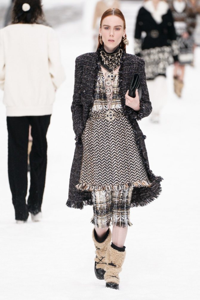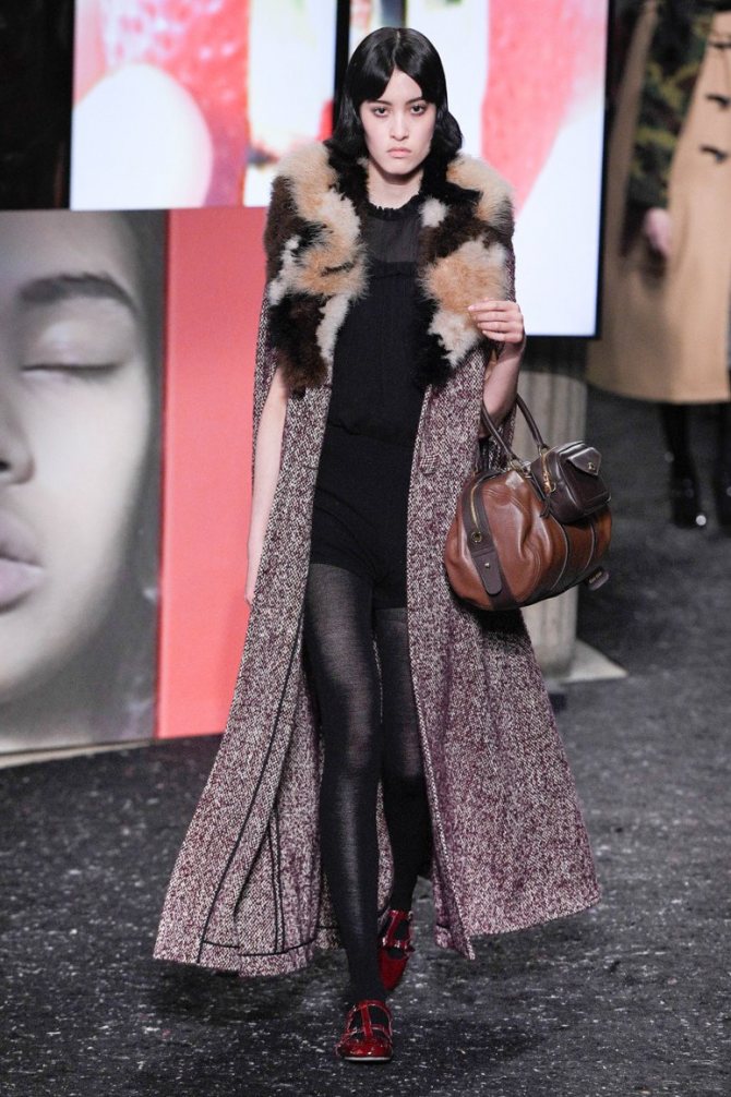 Привычное твидовое пальто привлекает внимание узорами: клеткой, елочкой, полоской. В декоре таких одежд можно увидеть сочетание твида с кожей, джинсовой тканью, мехом.
